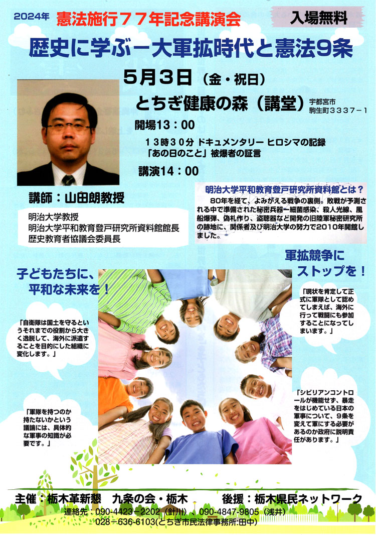お知らせ 憲法施行77年記念講演会 「歴史に学ぶ-大軍拡時代と憲法9条」 2024 5/3 (金 祝日) 開場:13:00 13:30 ドキュメンタリヒロシマの記録 「あの日のこと」被爆者の証言 開演:14:00 とちぎ健康の森(講堂) 宇都宮市駒生町3337-1 主催: 栃木革新懇,九条の会・栃木 連絡先 針川 090-4423-2202 浅井 090-4847-9805 とちぎ市民法律事務所 田中 028-636-6103