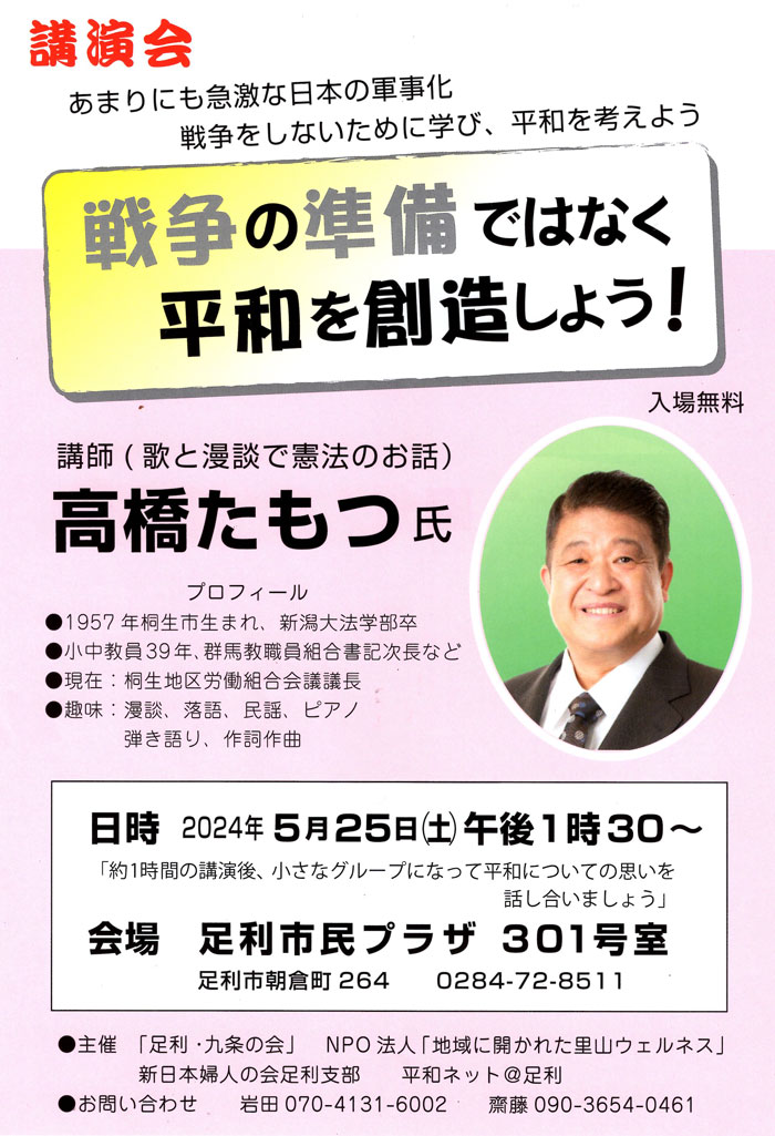 お知らせ 講演会「戦争の準備ではなく平和を創造しよう」 2024 5/25 (土) 13:30開演 足利市民プラザ 301号室 足利市朝倉町264 電話 0284-72-8511 主催: 「足利九条の会」 NPO法人 「地域に開かれた里山ウェルネス」 連絡先 岩田 070-4131-6002 齋藤 090-3654-0461