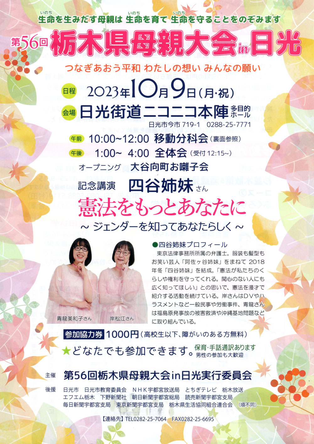 お知らせ 生命を生みだす母親は生命を育て生命を守ることをのぞみます つなぎあおう平和 わたしの想い みんなの願い 『第56回 栃木県母親大会 in 日光』記念講演 四谷姉妹 さん 「憲法をもっとあなたに」-ジェンダーを知ってあなたらしく- 主催:第56回 栃木県母親大会 in 日光実行委員会