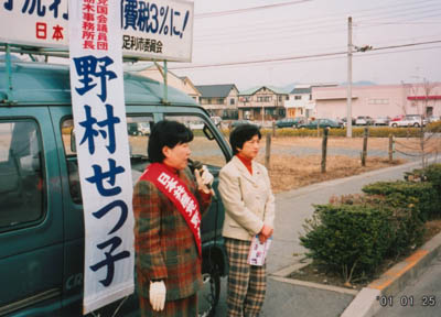 ▲▲ 野村せつ子さん(左)と一所に街頭演説する尾関さん(右) 2001.01/25(写真提供:おぜき栄子)