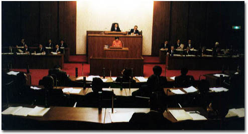 ▲▲ 足利定例市議会で一般質問をするおぜき栄子議員 1999年(写真提供:おりひめ新聞)