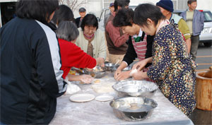 □□■■■ ご婦人たちは,突立ての餅にアンをくるんだり, 大根おろしをからめたり,きな粉をまぶしたり. 会場で,おいしくいただきました.